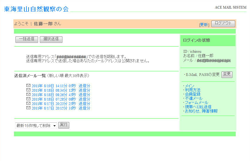 ログインすると、ユーザー専用の画面が表示されます。 一括送信、選択送信、送ったメールの開封状況などを確認します。