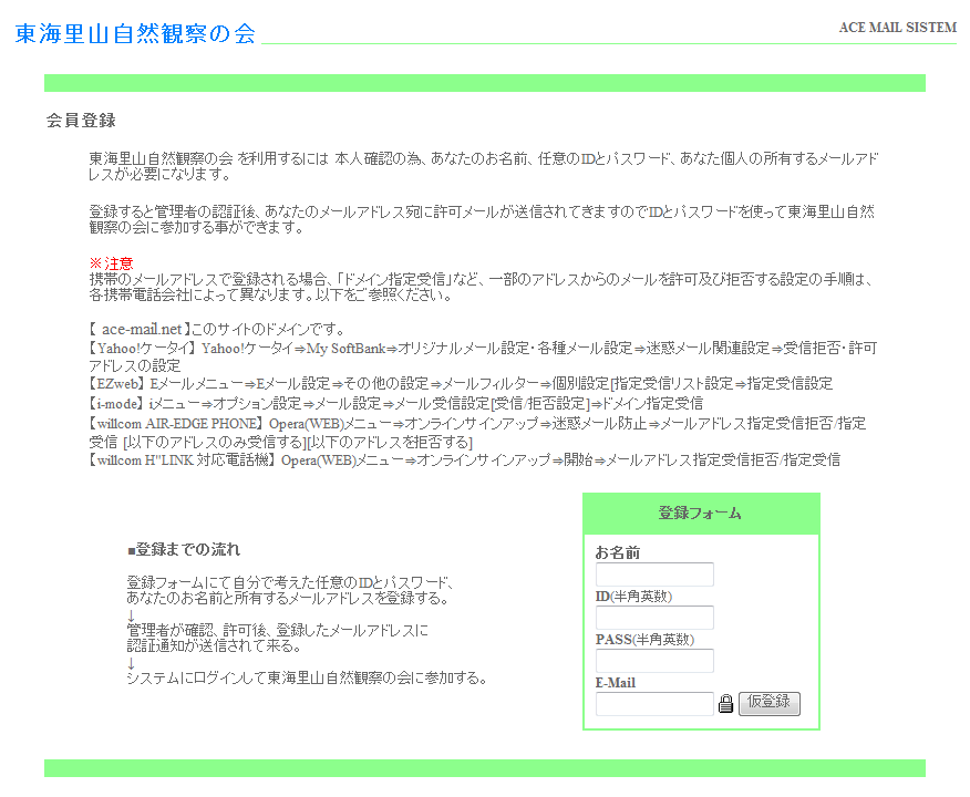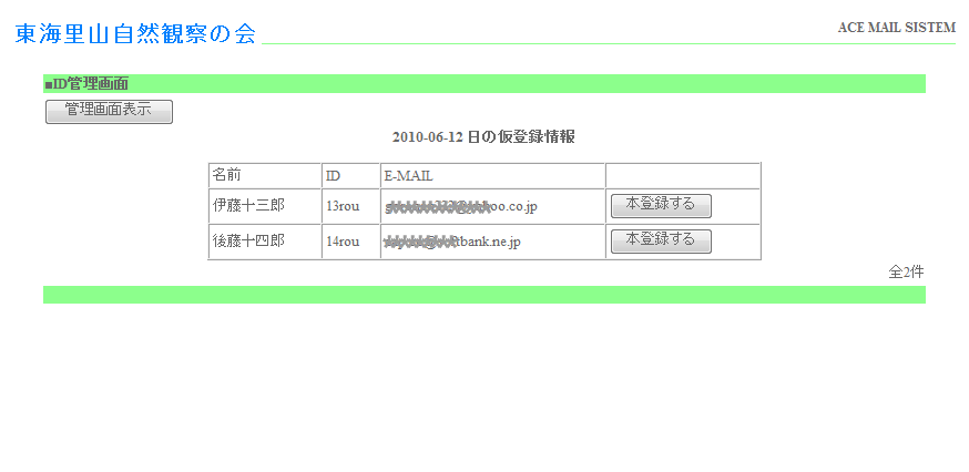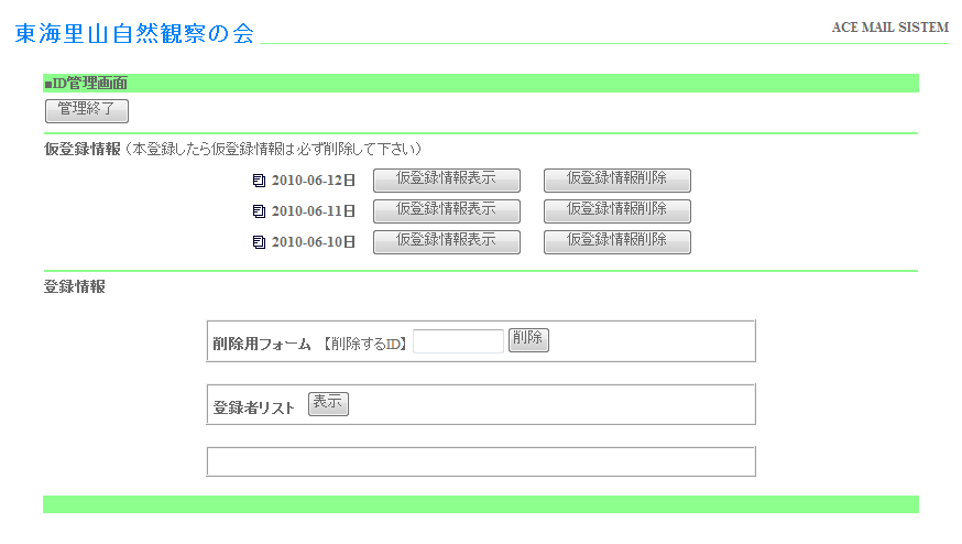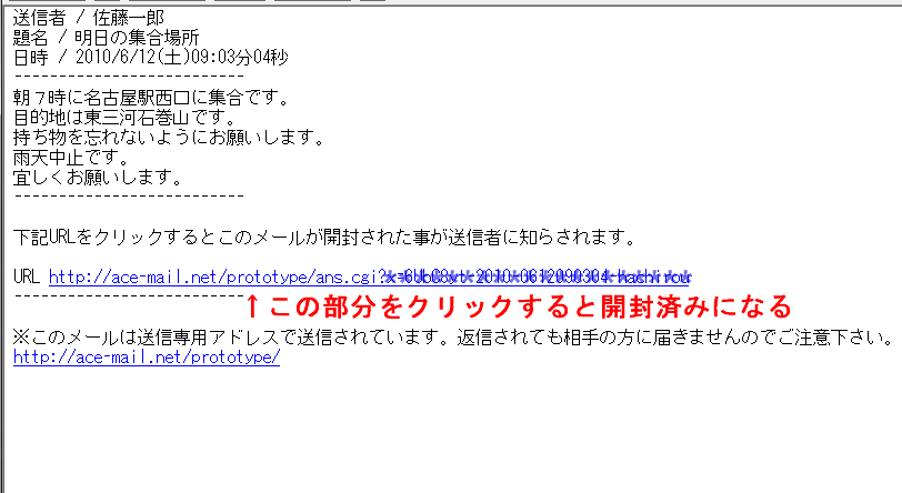 α版(アルファ版) サンプル パソコン / モバイル 受信メール内から開封通知をする事により、送信者へ開封した事を知らせる事が出来ます。 送信済みメールの記録や開封者人数のグラフ表示機能などあり。携帯電話、スマートフォンでも操作可能。 主な機能 ・一括メール送信、個別メール送信 ・登録者の全てが送信、受信が可能 ・使用制限人数100人 ・個別のIDとパスワードにより認証 ・開封確認機能あり ・不達メールアドレス(リターンメール)表示機能あり ・メールの文字コード Unicode 、jis 選択式 ・メールアドレス表示(登録者判断) ・上級者向き 1、ACE MAIL α アルファ版 への移行方法 ACE MAIL フォームメールより移行の連絡を行う。2、管理者による設定 「基本設定」画面にアクセス、ログインし、3、登録の告知 管理者はグループメンバーにACE MAIL に登録してもらうように呼びかけます。4、グループメンバーによる登録 グループメンバーが各々に「会員登録」より登録を行います。5、管理者認証 管理者は「管理者認証」よりログインし、仮登録状態のグループメンバーを本登録にします。仮登録は日付ごとに分かれています。6、ログイン、メール送信 システムにログインし一括送信か選択送信かを選びボタンを押します。受信者に開封確認を求める場合は「送信内容記録、開封通知」を選択し送信します。7、メールの受信 ACE MAILから発信されたメールを受信すると、本文の下の方に「下記URLをクリックすると、このメールが開封された事が送信者に知らされます。」という文字が挿入されています。その下のURLをクリックする事によって、メールが開封された事がACE MAILのサーバーに記録されます。8、開封確認 送信済みメールを選択し表示させます。送信した人と開封した人の名前が表示されます。また、グラフにより開封した人数の割合が表示されます。 8、不達メール確認 送信したが、宛先不明で帰って来たメール(リターンメール)を表示します。 |